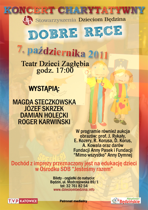 7 października o godz. 17:00 w Teatrze Dzieci Zagłębia im. Jana Dormana w Będzinie odbędzie się Koncert charytatywny DOBRE RĘCE.