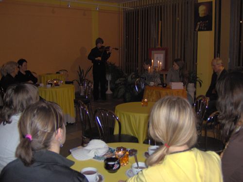 Sympatyczne grono młodych poetów i prozaików otoczył naprawdę wyjątkowy nastrój. A to za sprawą skrzypiec, wiersza, rozmowy i wzajemnej życzliwości. Myślę, że każda z osób obecnych zyskała dzięki temu wieczorowi sporo nadziei, twórczej energii, tracąc przy tym co nieco podskórnego smutku i niepewności. Bo tak jest zawsze, gdy w miejscach spotkań ludzi pojawia się prawdziwe życie…